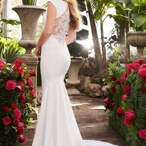 Mikaella 2250 is a crêpe and guipure lace wedding gown. It features a beautiful boat neckline and slimming cap sleeves. This dress is endowed with lace appliqués on illusion back and front cut outs. A crêpe belt at waist frames and highlights the waist, before finishing it a curve enhancing fit and flare skirt with inverted seam at back of train.