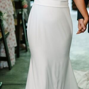 Selling my wedding dress! Bought new and worn in May 2025 for my wedding. I got a size 10 and it has been altered to fit someone who is roughly 5' 2" and 130lbs. Open to negotiation!