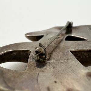 Good vintage (unpolished) condition with two visible dents on the back side. Minor scratches (seen with the loupe) are throughout. The clasp is quite small and the pin has to be snapped into place. Normal wear for age. Please see all photos.