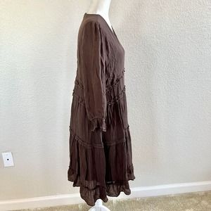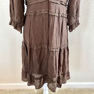 Embrace your inner bohemian with this chic and timeless Mikarose The Charlie Large Tiered Midi Dress. The dress comes in a beautiful brown color with a V-neckline and puff sleeves. Its knee-length and layered accents give it a classic and retro vibe, making it perfect for any occasion, whether it's casual or business.