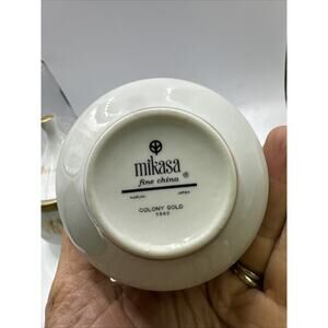 This elegant Mikasa Colony Gold fine china set includes a sugar bowl and creamer, perfect for adding a touch of sophistication to your tea or coffee service. The intricate Colonial-style pattern in gold and white is truly eye-catching and will impress your guests. Made of high-quality bone china, this set is durable and will last for years to come.