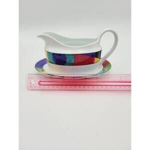 The Mikasa California M5101 Gravy Boat and Plate set is a vintage piece from the 1980s, originating from California, United States. Made of Bone China in a multicolor pattern, this set features a contemporary design with an impressed backstamp. The set includes a gravy boat and plate, both showcasing a unique Currents Ceramic style that is characteristic of the Mikasa brand.