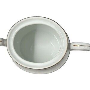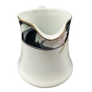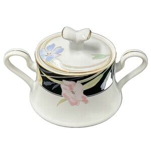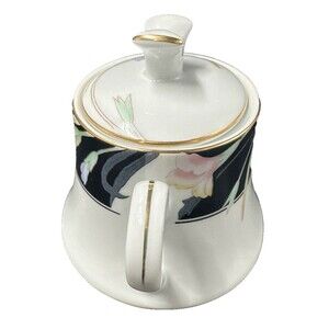 Elevate your tea party with this elegant Mikasa Charisma creamer and sugar bowl set. The set includes a beautiful black porcelain sugar bowl with a lid, perfect for storing your favorite tea or coffee creamer. The floral pattern adds a touch of sophistication to your table setting. Made in Japan, this set is a must-have.