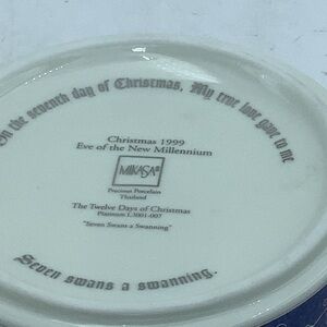 Vintage Mikasa porcelain trinket box featuring the Seventh Day of Christmas - Seven Swans a Swanning. Rimmed in silver, this is a stunning piece. Pre-owned, good condition.