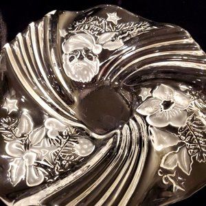 Clear Crystal with Etched and Frosted Christmas Holiday florals and Santa Clause. Swirled Candy Dish or center piece for your holiday table setting.