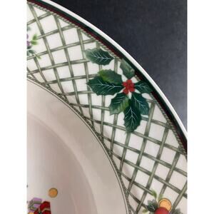 Bring timeless charm to your holiday table with this Mikasa Christmas Story large round vegetable serving bowl, made in the 1990s. This beloved pattern features a green lattice border adorned with alternating holly berries and fruit motifs. At the center is a beautifully detailed Christmas tree surrounded by festive gifts, perfect for your holiday gatherings.