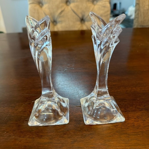 Very beautiful Mikasa Lead Crystal Candle Stick Holders. They are so delicate and lovely. The pattern is called Deco and they have a tulip or V shape at the top. Minor wear. No chips or cracks.