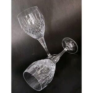 This pair of Mikasa Coventry crystal Tulip bowl shaped wine glasses / water goblets feature a distinctive criss-cross vertical cut pattern above a band of diamond cuts, with a plain, polished base. This design creates a sparkling, light-reflective quality, giving the glassware a glimmering and luxurious appearance. The crystal is clear and transparent, showcasing its delicate and brittle nature, with a refined ornate aesthetic suitable for formal dining occasions, celebrations, or toasts. The craftsmanship is evident in the precise cuts and polished finish, making each piece appear shiny and sophisticated, ideal as heirloom-quality tableware or decorative serveware.