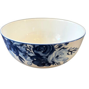 Blue floral pattern on white with blue on top edge.