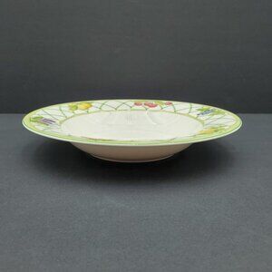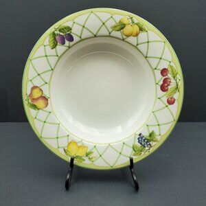 Mikasa Optima Fruit Rapture Rim Soup Bowls Individual Pasta Bowls Salad Bowls - Set of 4. Excellent pre-owned condition. 9-1/8" x 1.5". Pattern from the 2000's featuring white fine china with blueberries, cherries, pears, lemons, apricots, blackberries, and lattice on the rims.