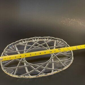 This Mikasa Hampshire Gold oval crystal platter is a stunning piece, perfect for both elegant occasions and everyday dining. Measuring 15 inches long and 10 inches wide, this platter features a delicate gold-rimmed edge, adding a touch of luxury to its timeless crystal design. The clear crystal beautifully reflects light, making it ideal for serving appetizers, desserts, or as a decorative centerpiece.