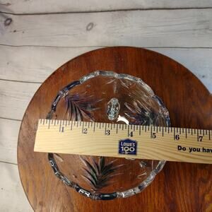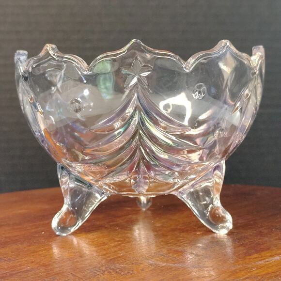 Mikasa Holiday Evergreen Emerald 3-Footed 6" Open Candy Dish Bowl. Thick clear glass with three emerald green trees. Preowned excellent condition with no chips or cracks. From a non-smoking home. The Mikasa sticker is gone.
