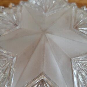 Stunning vintage Mikasa Japan diamond fire pattern crystal lidded dish in like new condition with Mikasa sticker. The top star is frosted. 4" tall by 5.5" across.
