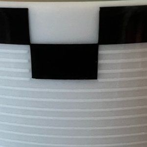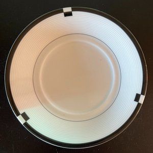 Mikasa Fine China flat cup and saucer set in Midnight pattern L5542. Beautifully designed in white with thin white rings and black band border The cup measures 2.1/4“ tall and, 3 ⅜” diameter. The saucer plate is 6” diameter. Microwave and dishwasher safe. Crafted in Japan.