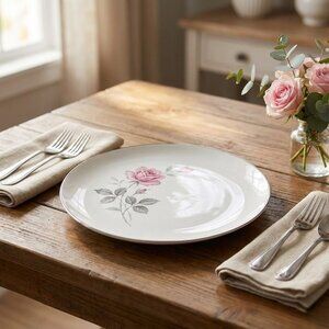 This Mikasa dinner plate features a delicate floral design with a pink rose and silver accents. A fine addition to a vintage table setting.