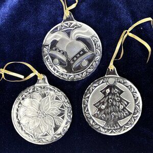 The Mikasa Holiday Three Round Glass Etched Crystal Ornaments feature a festive design of trees, poinsettias, and bells, perfect for adding a touch of sparkle to your Christmas tree.