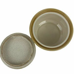 Vintage Mikasa Stone Manor mini/personal casserole dish w/ lid. Speckled cream w/ tan edges. 12 oz maximum capacity. Oven to table. Midcentury kitchen.