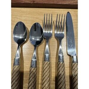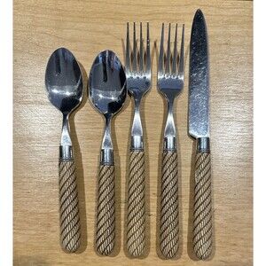 Here is a fun set of Mikasa Thailand MIS33 Flatware Set Of 5 With Brown Tan Swirled Stripes in good used condition. Includes butter knife, 2 spoons 7 inches and 2 dinner forks.