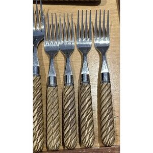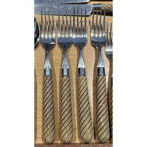 Here is a fun Mikasa Thailand MIS33 Stainless Flatware Service for 4 Brown Tan Swirled Stripes in great used condition.