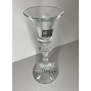This candle holder is suitable for taper or dinner candles, and stands at 6.25 inches tall with a width of 2.5 inches. The production technique is studio crafted, and the item belongs to the Mikasa product line. With its elegant glass production style, this candle holder is perfect for any occasion.