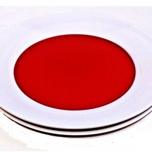 Listed for sale are Two (2) Red and White Stoneware Dinner Plates by Mikasa Gourmet Basics in Hunter Pattern. The plates feature a Bold Red Center and White Border. The Plates are in excellent condition, free of Chips, Scratches, Cracks, Crazing, and Stains.