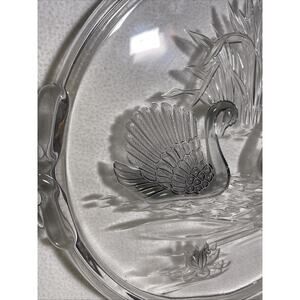 The Mikasa Walther Crystal Cake Plate or Serving Tray features a beautiful design of swans, making it a stylish addition to any occasion. Made in Germany, this vintage piece is crafted from crystal with etched details and clear frosted color. With a round shape and contemporary style, this tray is 12" in diameter with handles for easy transport. It is a unique and elegant piece that is sure to impress guests at any event.