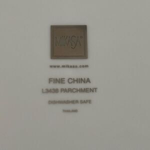 Parchment dinnerware collection features a gentle gray border embellished with a beautifully detailed scroll design. This chic and elegant collection is accented by inner and outer borders of platinum. Crafted of porcelain with metallic accent banding. Dishwasher safe. Not Microwave safe.