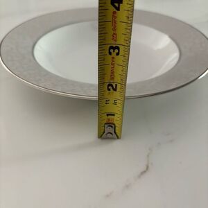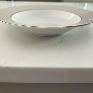 Parchment dinnerware collection features a gentle gray border embellished with a beautifully detailed scroll design. This chic and elegant collection is accented by inner and outer borders of platinum. Crafted of porcelain with metallic accent banding. Dishwasher safe. Not Microwave safe.