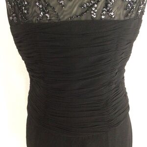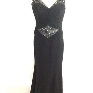 This elegant black evening gown exudes timeless sophistication with its flattering silhouette and exquisite detailing. Key features include: