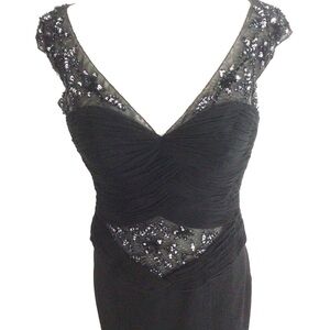 • V-neckline and cap sleeves, both adorned with intricate black beadwork and sequins, adding a subtle shimmer.
