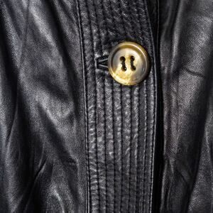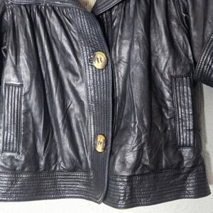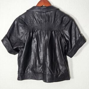 This Mike & Chris cropped leather jacket brings an edgy urban streetwear vibe with its soft black leather, bold gold buttons, and signature gathered detailing. The structured collar, short sleeves, and cinched back give it a sculpted silhouette that feels elevated and cool in that early-2000s designer way the brand is known for.