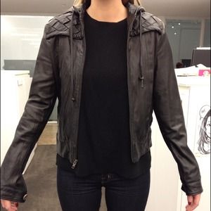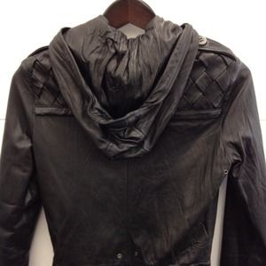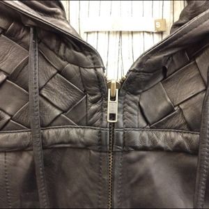 Beautiful new leather jacket! Mint condition! Purchased for $1,065. Distressed looking hooded leather jacket with woven detail.