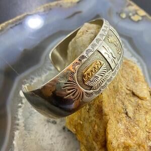 Beautifully Detailed Sterling Silver and Gold Filled Overlay Kokopelli and Pottery Flexible Stamped Bracelet For Women, Signed by Native American Artist Mike Smith.