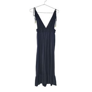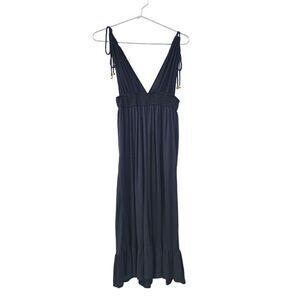 Features smocked empire waist and spaghetti straps with tassle ends and ruffle hemline.