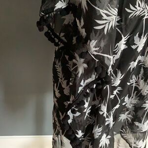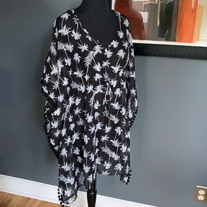 Miken Swim black and white palm tree print sheer swimsuit coverup. Side seams with wide side panel creates kimono sleeves. Edged in small black pom pom trim. Deep V back with neckline tie. Deep V front neckline. Front waist string tie. Large. New, with tag. Nonsmoking home.