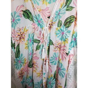 Miken Swim Floral Tie Waist Deep V Lace Trim Sheer Kaftan Swim Coverup Beach