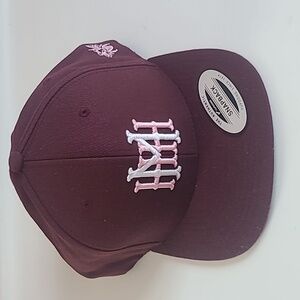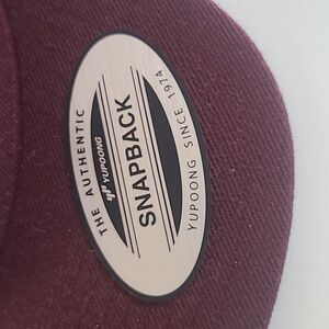 Stylish maroon snapback hat featuring a bold white logo. Perfect for casual wear.