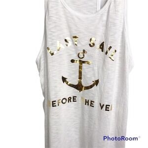 Brand new without tags Mikey Swim beach coverup. White muscle tee style tunic. Gold shine text and anchor graphic. Says Last sail before the veil.