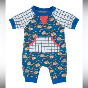 Romper is new with tags and in excellent condition with no stains or flaws. Fabric is a soft think t-shirt material.
