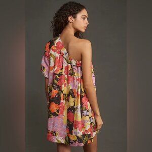 Anthropologie dress, floral dress, one shoulder dress, summer mini dress, boho chic, vacation dress, tropical dress, Mikiko Noritake, loose fit dress, puff sleeve dress, bright floral dress, casual beach dress, statement dress