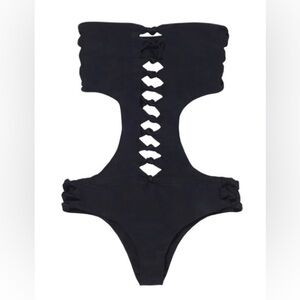Mikoh Swimwear Sydney One Piece Swimsuit Night has sexy cutout knot detailing on the front as well as on the top and bottom. This is a one piece version of the Monaco top and the Hanalei skimpy bottom. It is original and looks fabulous on!
