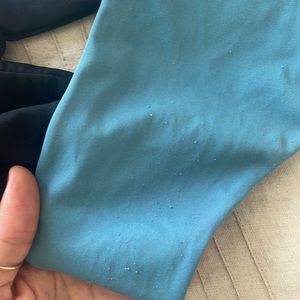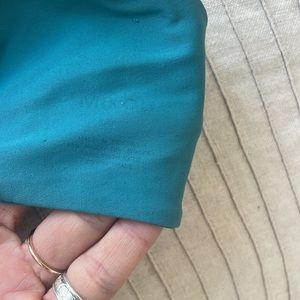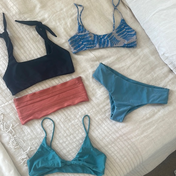 Have too many bathing suits and ready to rotate these out. They are used with a little pilling. Still super cute and they look wrinkled here but lay flat when wearing. The coral Bandau has some little dirt stain under the armpit. With good bathing suit cleaner you could prob get it out. As you can see Some of the inside font wore off so it’s hard to tell exact sizing. But if you know mikoh they are pretty stretchy. I used to wear them with my pre pregnancy boobs size small C and now wear them now that I am flat, size A :) let me know if you have any questions. I’d like to sell all together!