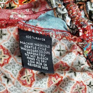 Vibrant bohemian patchwork crop top from Ruby & Me. Features long puff sleeves with elastic cuffs, off-shoulder neckline, ruched bust, and ruffle hem. Lightweight 100% rayon fabric, perfect for festivals, summer events, or casual chic looks.