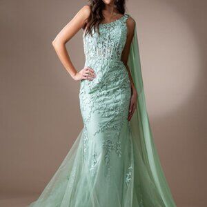 Embrace your inner romantic with this captivating one-shoulder prom dress. The dress features a stunning floral lace overlay that cascades down the bodice and skirt, creating a whimsical and unforgettable look. The one-shoulder corset top flatters your figure and adds a touch of drama, while the floor-length shoulder sash adds a touch of elegance and movement.