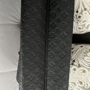 Designer look with the high price. Gold accents. Embossed black PU. Two straps for carrying it as a tote and the other as a shoulder strap.