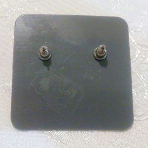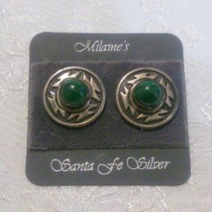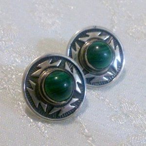 These lovely vintage earrings are fashioned in sterling silver and are set with malachite stones at the center. The earrings are on their original card from Milaine's Santa Fe Silver. Earrings are fashioned in a post back style for pierced ears and measure 3/4" in diameter.