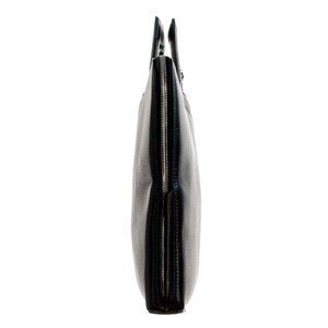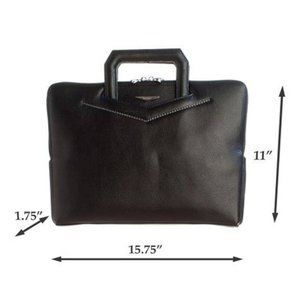 There are 2 outer velcro pockets that allow the handles to pop in and out plus adding little storage space. Fully lined with a signature satin lining. Inside there is a non-padded sleeve for your computer/tablet, a leather business card sleeve, zip document pouch, two side pouches for a cell phone or other and a pen holder.