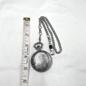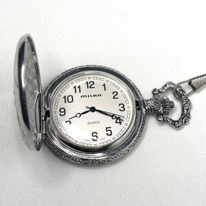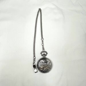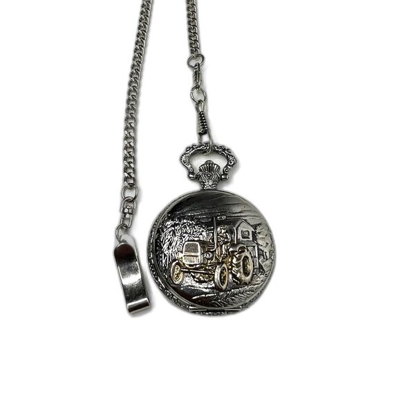 Milan Quartz Silver & Gold Tone Tractor Pocket Watch w/ Chain. It has floral engraving on the back.