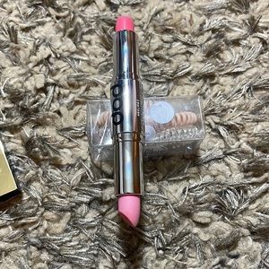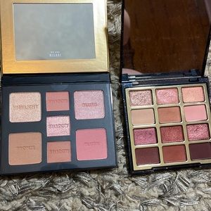 This bundle has a milani eyeshadow palette … a milani brand new never opened full face palette… set of 5 hair ties … a pop beauty lip duo … and a pink lip pops loose setting powder in translucent