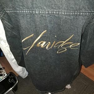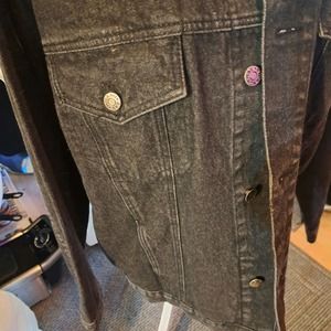 Milano Bay Size Large Black Denim Jacket with Gold Embroidery on Back - seems like it was not worn could be new. It is a beauty and i do not know what the gold embroidery is on the back.